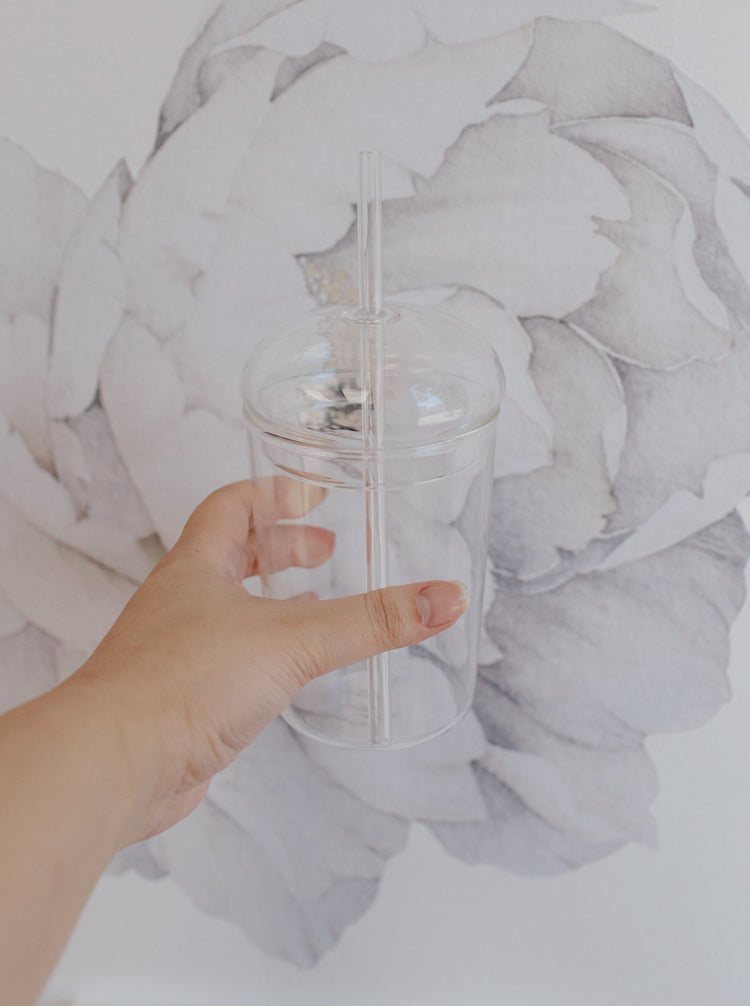 Comes with cup, lid and glass straw