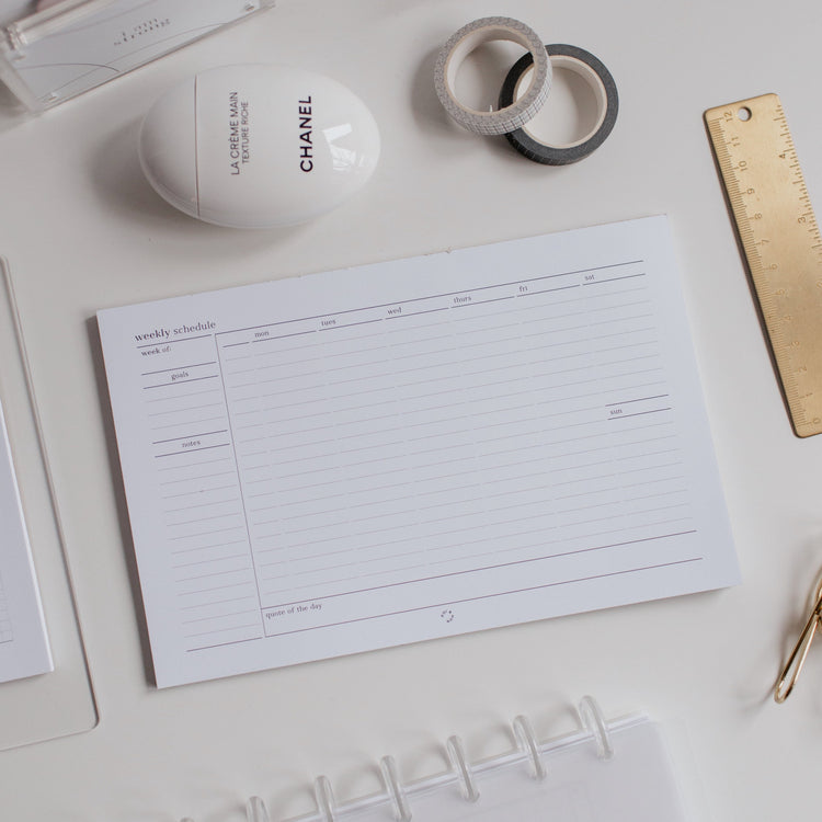 It's almost the weekend, keep your week together. This Weekly Schedule Notepad sits on your desk. Plan the schedule for your week and setup to-do lists. You can hole-punch pages and slide them into your half letter discbound planner!