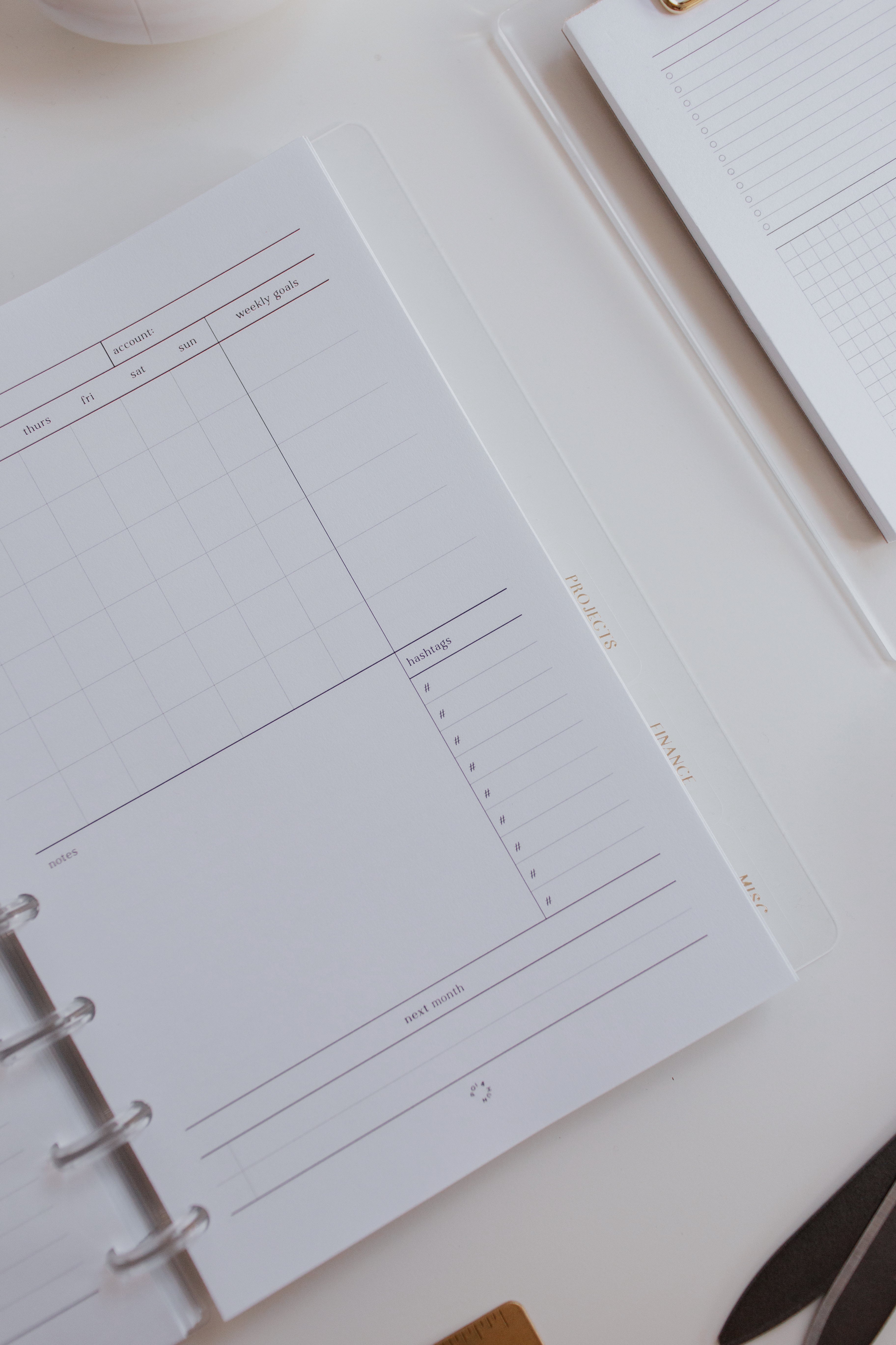 - Monthly: Month On 1 Page, Weekly Goals, Notes, Hashtag, Next Month To Do